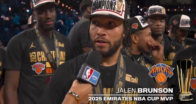布倫森賽后憑借NBA杯決賽的出色表現(xiàn),以及本屆杯賽的整體優(yōu)質表現(xiàn),他在本屆NBA杯的淘汰賽階段,場均得到33.3分6.7助攻,投籃命中率55%。布倫森成功當選NBA杯MVP,也是詹姆斯與字母哥后第3位獲得NBA杯MVP的球員。